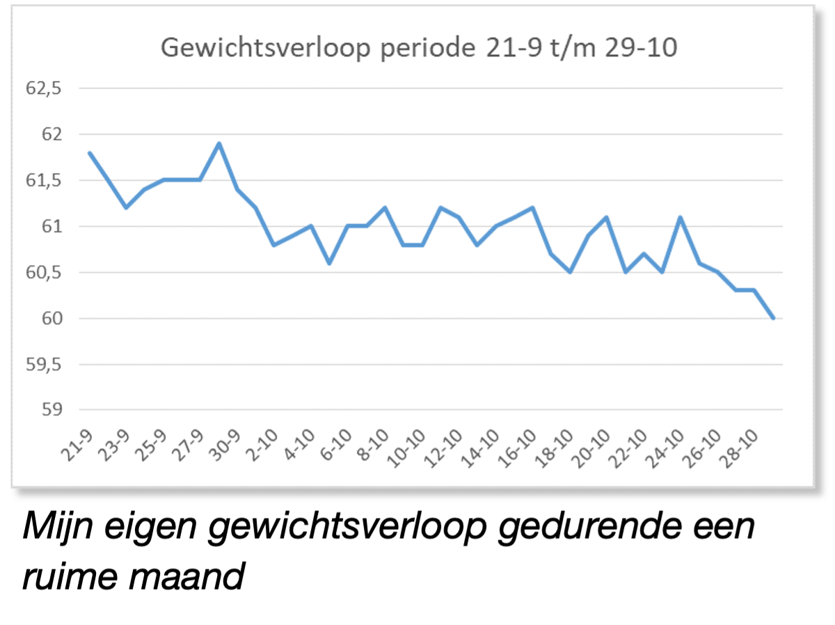 Al deze dingen kunnen ervoor zorgen, dat je gewicht soms wel met een pond omhoog of omlaag gaat! En dat is dus schrikken. Zeker als je een paar dagen achter elkaar in gewicht omhoog gaat, terwijl je eigenlijk wilt dat het naar beneden gaat. Ik heb mijn gewicht een periode elke dag bijgehouden. Je ziet dan dat ik, in de periode dat ik ongesteld was, 'stilstond': mijn gewicht ging omhoog en naar beneden, maar bleef feitelijk gelijk. En mijn gewicht wisselde weleens met een pond per dag!